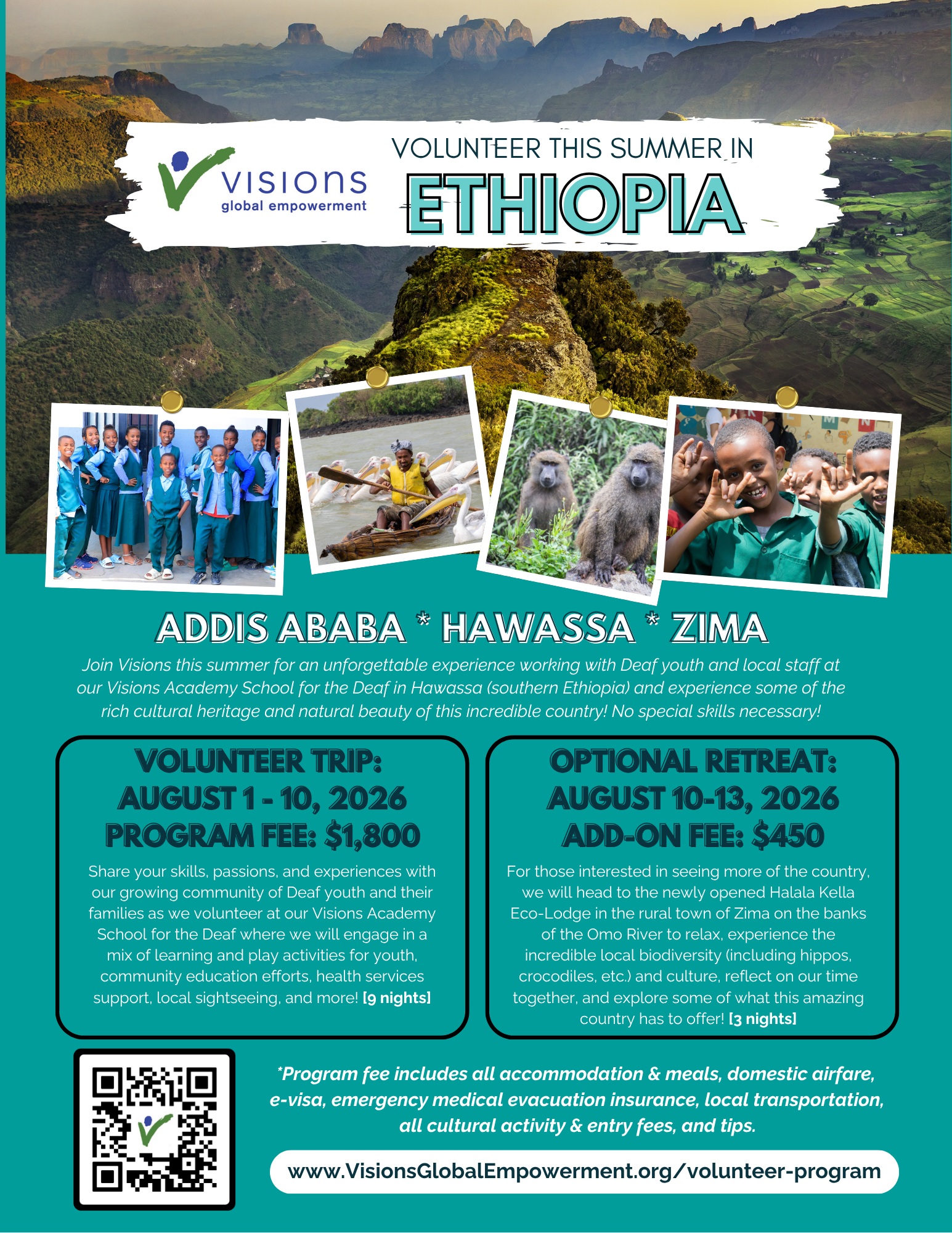 This summer, we are heading back to Ethiopia to work with our local counterparts at Visions Ethiopia in helping support our ongoing efforts to educate and empower the Deaf community in Ethiopia! All international air travel will be in and out of the airport in the capital city of Addis Ababa (ADD) where we will spend just one night (8/1) on arrival. After taking a short domestic flight the next day (8/2) to the southern city of Hawassa, we will stay at a very comfortable hotel in the city (for the next 8 nights) and conduct all our service activities at our Visions Academy - School for the Deaf for the next week. We will be working with our staff (half of whom are Deaf), Deaf youth of all ages and their families, and the community at-large. At the end of the trip, for those who wish to see a little more of the country, including the incredible biodiversity of this area, we will spend 3 nights relaxing and touring the stunning area of Zima.